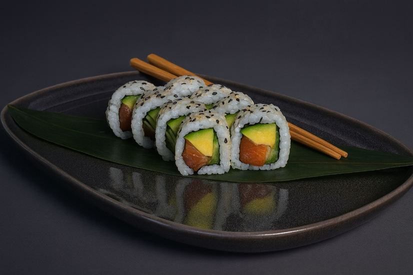 Saumon, concombre, avocat, sésame, riz sushi, mayonnaise japonaise, algue nori