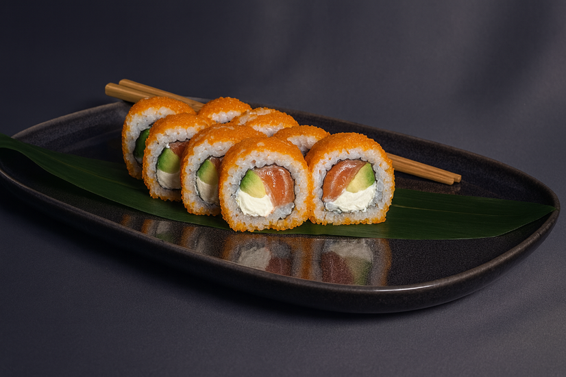 Saumon, avocat, fromage Philadelphia, spicy mayo, œufs de tobiko, riz sushi, algue nori