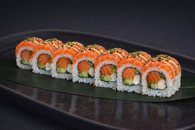 Riz à sushi, feuille de nori, saumon (à l’intérieur et sur le dessus), fromage frais, avocat, concombre, sauce épicée, graines de sésame.