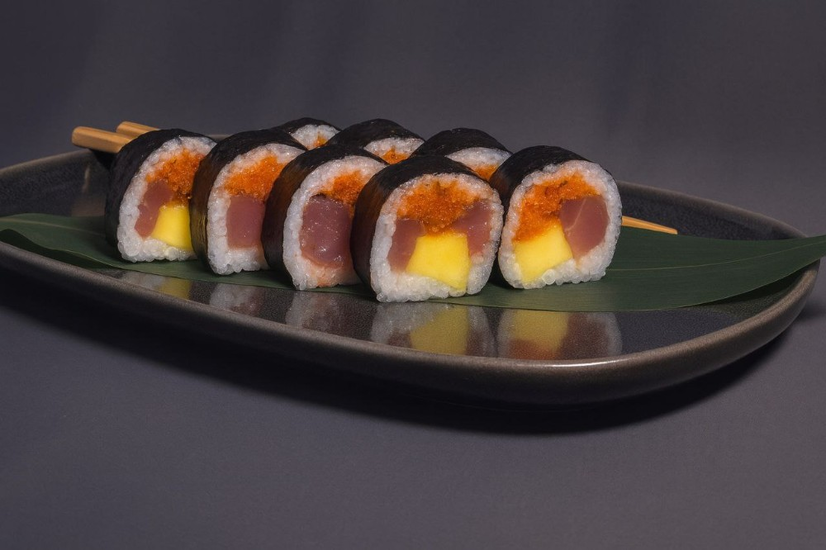 Riz à sushi, feuille de nori, mangue, thon, œufs de tobiko, concombre, avocat.