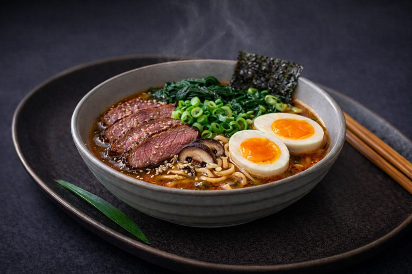 Bouillon japonais, nouilles ramen, porc chashu, œuf mariné, ciboule, algue nori, pousses de bambou, champignons, graines de sésame.