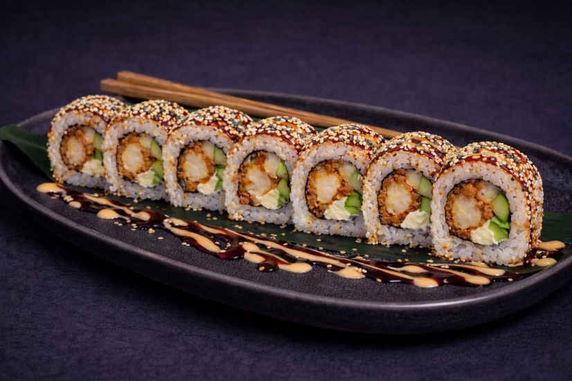 Sésame, crevette tempura, riz, nori, fromage frais, concombre, omelette, mayonnaise épicée, sauce teriyaki
