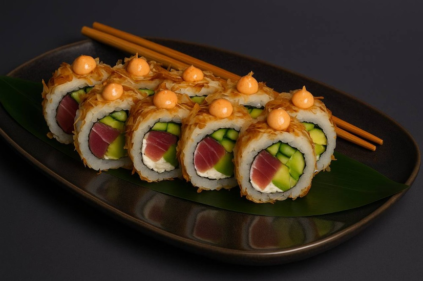 Riz, nori, thon, mayonnaise épicée, avocat, tobiko, copeaux de thon, thon croustillant, fromage frais