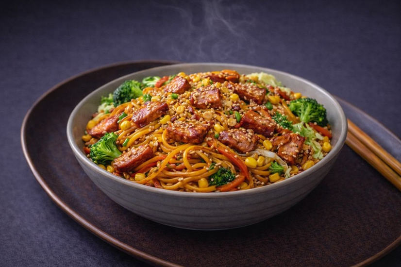 Nouilles aux œufs, Protéine au choix, Sauce maison, Œuf, Gingembre, Oignon, Ail, Carotte, Maïs, Champignons shiitaké, Brocoli, Chou chinois, Germes de soja,Sésame