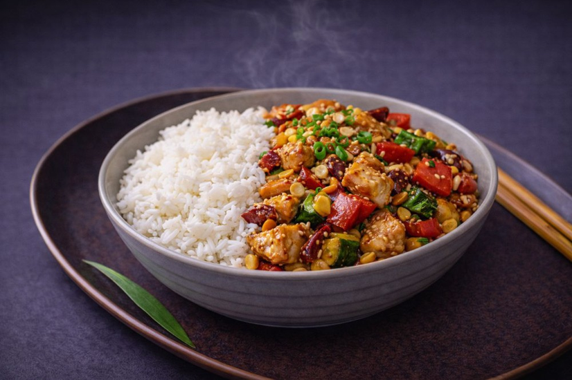 Filet de poulet, Cacahuètes grillées, Poivron, Maïs, Chou chinois, Oignon, Ail, Gingembre frais, Piment rouge sec, Huile de sésame, Sauce Kung Pao, Riz